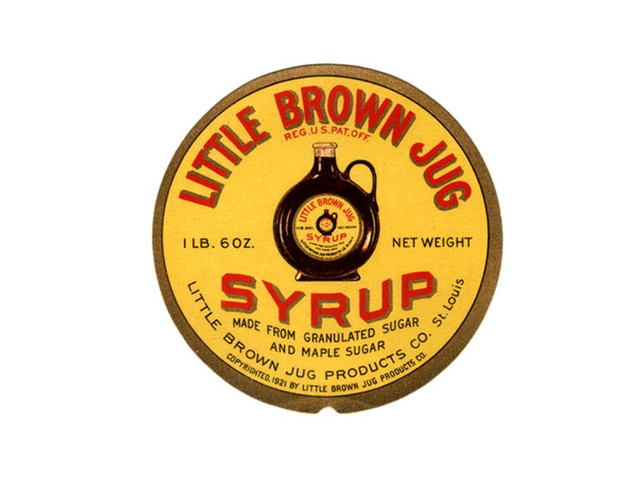 This vintage label is a little over 3" in diameter and dated 1921. It was used on Little Brown Jug syrup crocks like the one pictured on the label. We found an unused stock in their plant in St. Louis.