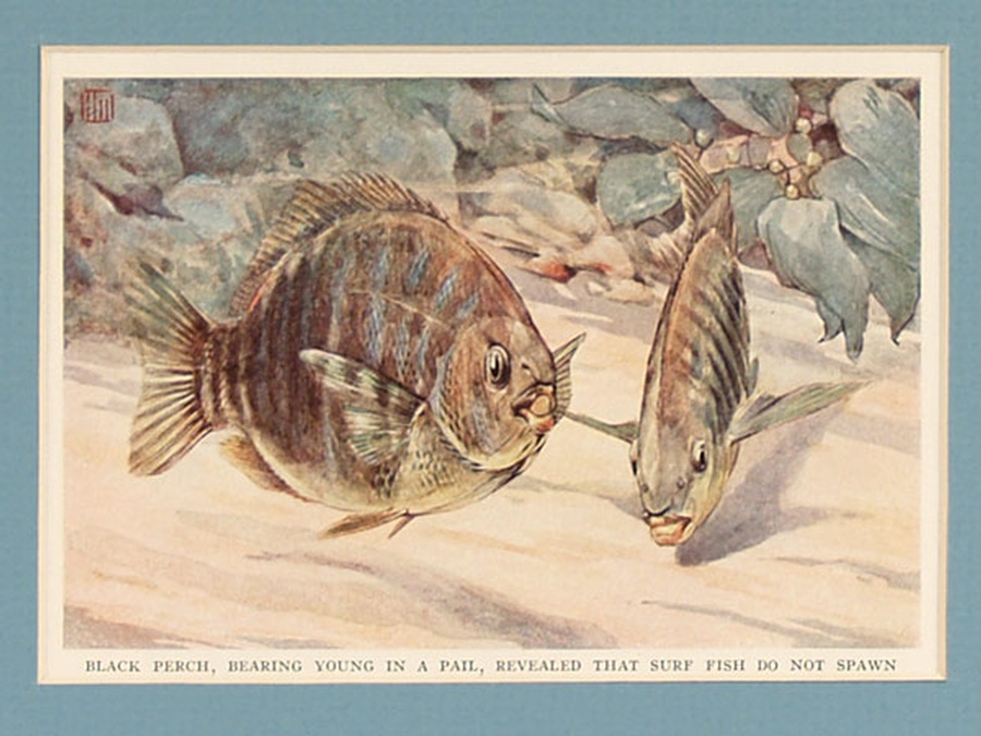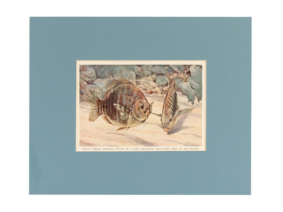 This vintage print shows the Black Perch, a common reef fish associated with near shore marine habitats of Southern California. Black perch are also called Black Surfperch and Butterlips. In spite of their name, these fish are rarely, if ever, black. Their coloration can be orange, red, gray, green, various shades of brown, and other colors. The black perch’s species name. Jacksoni, is derived from A. C. Jackson, the individual who, in the nineteenth century, first made the observation that Surfperches gave birth to live young. The print is professionally matted in an 8” x 10” baby blue colored matte to setoff the beauty of the fish. Our vintage prints are shipped in a plastic sleeve between cardboard stiffeners to arrive in perfect condition.