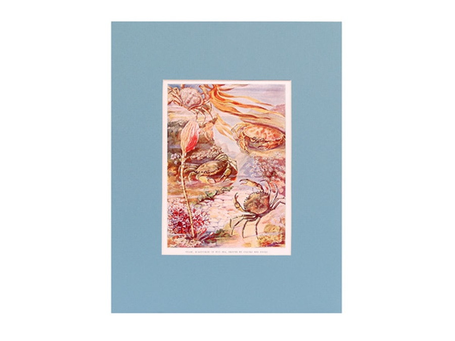 This vintage print features a pair of Green Crabs (foreground) in a sparring match; the Rock Crab, upper left, and a Jonah Crab crouching in a crevice at the right. The scene also has a Sea Potato with its just hatched young swimming about on the left with Irish Moss below. There is also a clump of pink-hearted Hydroids clustered in the right center. The print is professionally matted in a large 11” x 14” baby blue colored matte to setoff the beauty of the fish. Our vintage prints are shipped in a plastic sleeve between cardboard stiffeners to arrive in perfect condition.