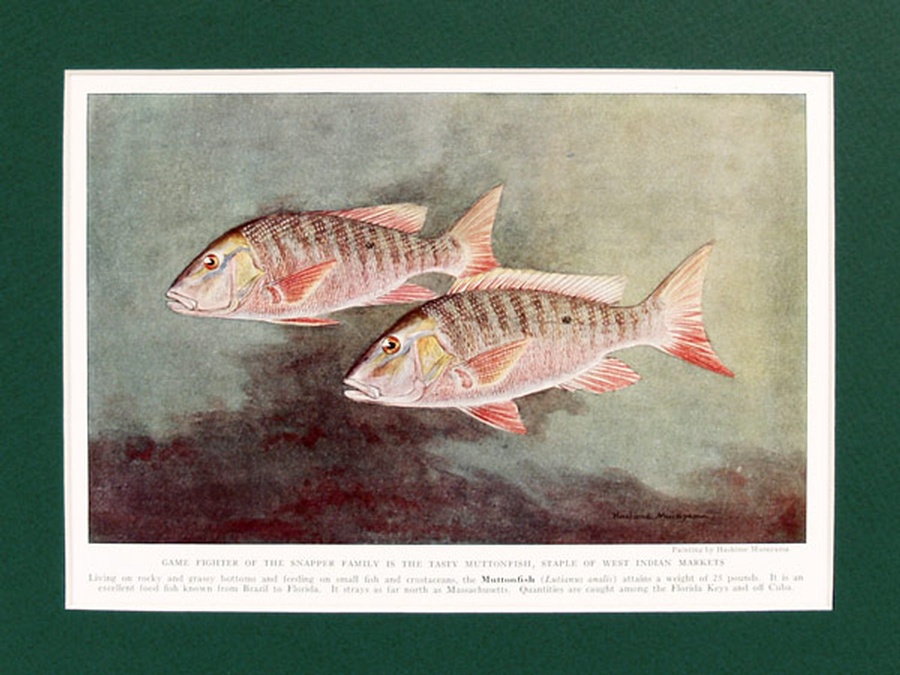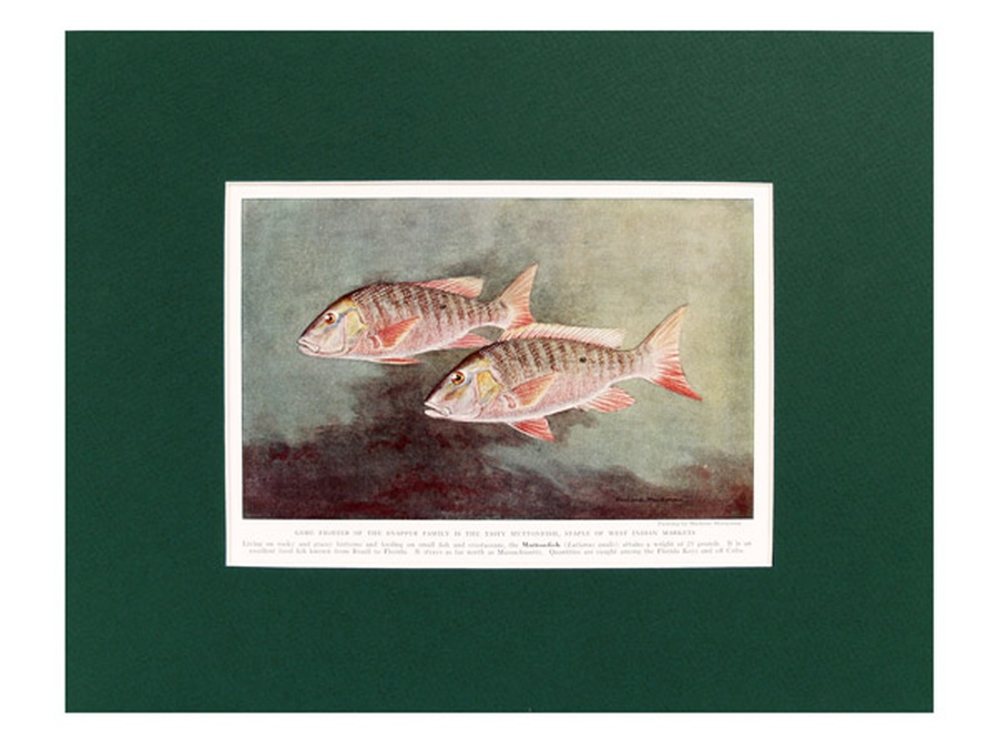 This vintage print shows the Muttonfish which attains a weight of 25 pounds. They live on rocky and grassy bottoms and feed on small fish and crustaceans. The Muttonfish is an excellent food fish and quantities of them are caught in the Florida Keys and off Cuba. The print is professionally matted in a large 11” x 14” dark green colored matte to setoff the beauty of the fish. Our vintage prints are shipped in a plastic sleeve between cardboard stiffeners to arrive in perfect condition.