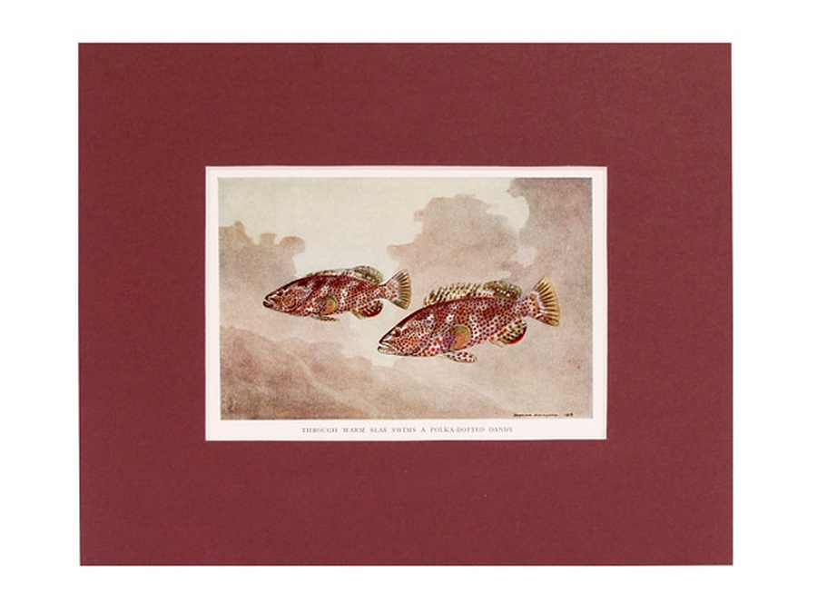 This vintage print features the Rock Hind which reaches a length of about 16 inches. Valued as food, this polka-dot beauty inhabits rocky spots in tropical American waters from Bermuda and Florida to Brazil. The print is professionally matted in an 8” x 10” burgundy colored matte to setoff the beauty of the fish. Our vintage prints are shipped in a plastic sleeve between cardboard stiffeners to arrive in perfect condition.