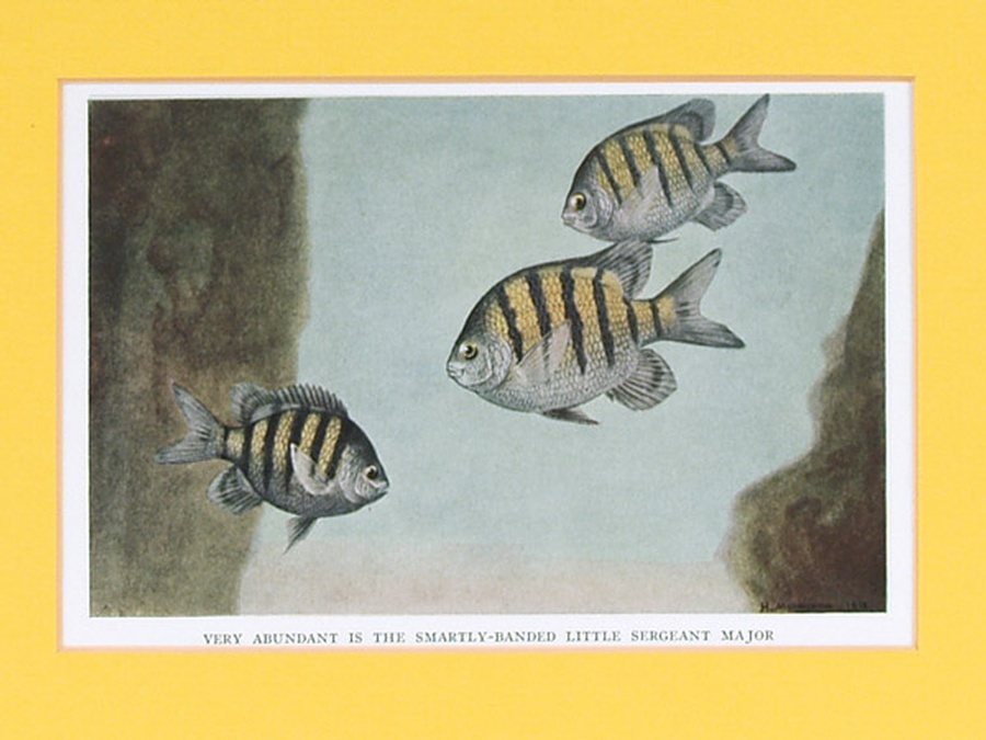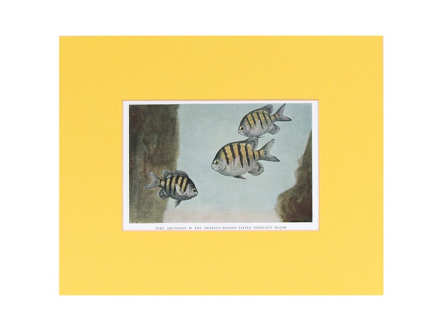 This antique color portrait features the colorful image of a group of Sergeant Major. The print comes from the book The Book Of Fishes, Revised and Enlarged Edition, Presenting the Better Known Species of Food and Game Fishes of the Coastal and Inland Waters of the United States edited by John Oliver La Gorce, Litt.D., D.Sc. Vice President, National Geographic Society. The book was originally copyrighted in 1919. This edition published by the National Geographic Society of Washington, D.C. is from 1939. The colored plates were produced from original paintings by Hashime Murayama and Else Bostelmann.This vintage print features the Sergeant Major or Cow Pilot which is a reef loving, non-food fish that lives in the tropical waters off the Atlantic and Pacific coasts of the Americas. The print is professionally matted in an 8” x 10” yellow colored matte to setoff the beauty of the fish. Our vintage prints are shipped in a plastic sleeve between cardboard stiffeners to arrive in perfect condition.