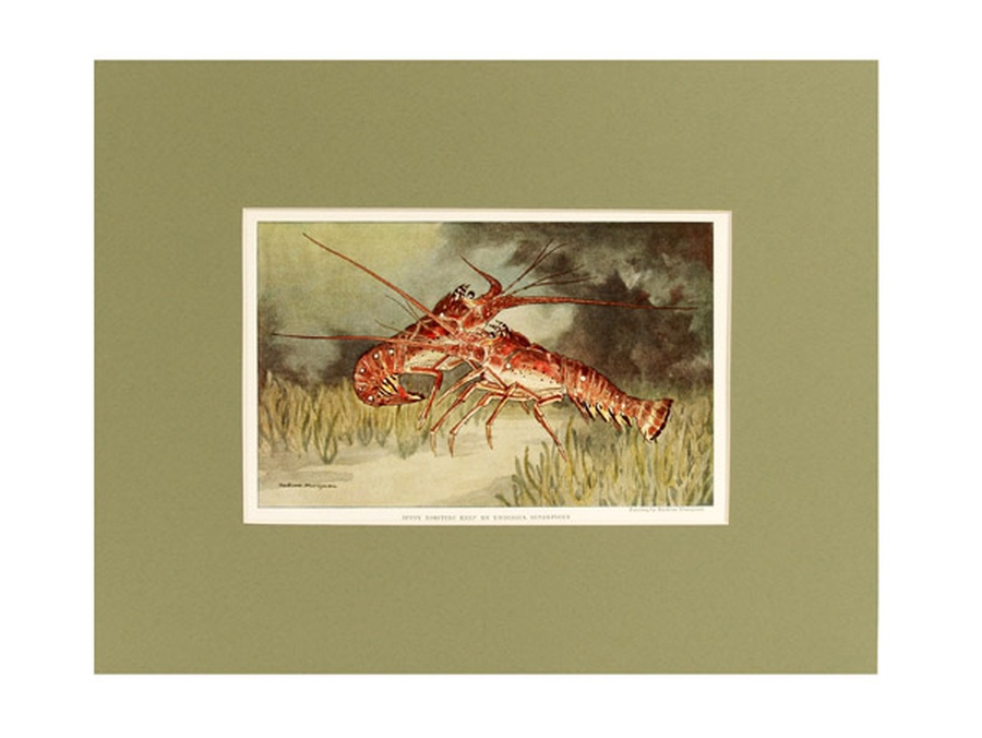 This vintage print shows a pair of Spiny Lobsters in a mating ritual. This shellfish, also called a Crayfish, can obtain a body length of up to 18 inches, but usually averages 10 inches. The female, on the left, has a small pinching claw on the last leg that is used to comb the eggs and free them from foreign substances. The Spiny Lobster is in quantities in the West Indies, Bermudas, and the Florida Keys. The print is professionally matted in a large 11” x 14” light green matte to setoff the beauty of the fish. Our vintage prints are shipped in a plastic sleeve between cardboard stiffeners to arrive in perfect condition.