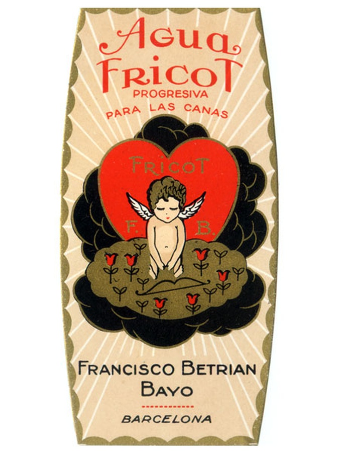 This antique perfume/cosmetic label is from the 1930s and measures 2” Wide x 4” High. It is from Francisco Betrian Bayo of Barcelona, Spain and features a whimsical valentine theme. The gold leaf fringed label displays a cute image of a Cherub backed by a red heart and on the ground with a bed of tulips. Although it is represented as a perfume, the translation is “Fricot water for progressive gray” which would indicate it was also used to cover grey hair or for the older generation. This unique label will be a welcome addition to your collection.