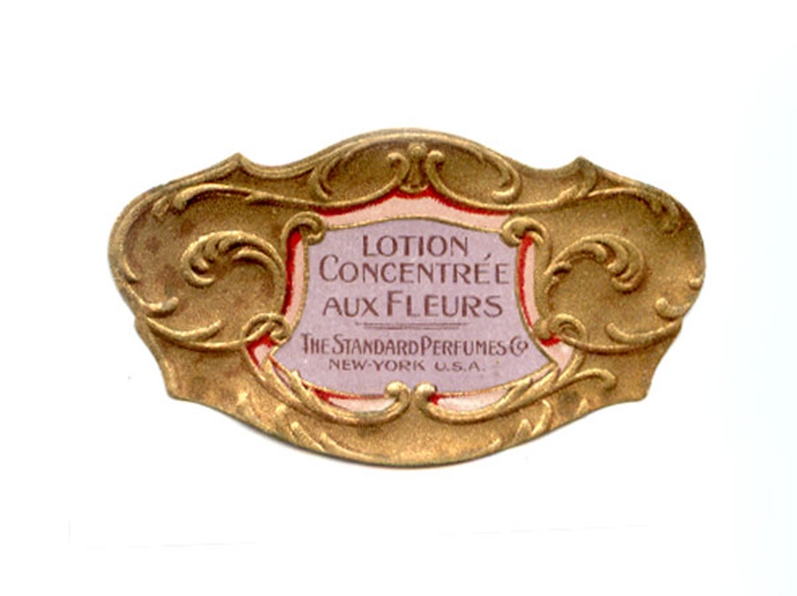 This antique cosmetic label is from the 1920s. The embossed and gold gilded beauty label is in mint condition and measures 2.5” Wide x 1.35” High. Original and very unusual, the French style label is from The Standard Perfumes Company of New York, New York. It is “Lotion Concentree aux Fleurs” which, although not pure French, translates to Concentrated Flower Lotion. What a great label to add to your collection.