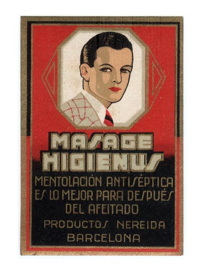 Here is one of the most unique boudoir labels I’ve seen. It features the image of a beautiful man or manly woman, depending on your interpretation. Never the less, it is gorgeous with gold trim and accents in mint condition. The label measures 3.5” Tall x 2.5” Wide and was made by Nereida of Barcelona, Spain in the 1930s.