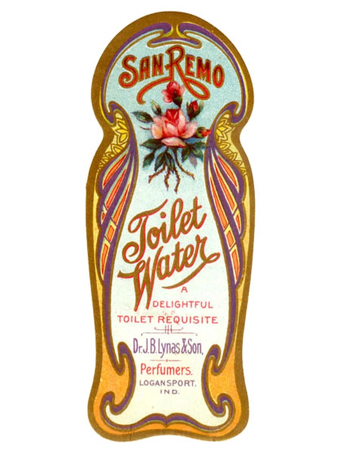 What a great label from the 1910s. It measures 3.75" Tall x 1.5" Wide with beautiful pastel colors and a pink rose that looks even better in person. Dr. Lynas began manufacturing remedies in his home in the middle 1800s after a successful medical career. In 1874 he established a laboratory and in 1898 he officially setup J.B. Lynas & Son. By 1913 the company had 1500 employees in Logansport, Indiana. It’s interesting that for this San Remo Toilet Water bottle, the company is listed as J.B. Lynas & Son, Perfumers, probably trying to establish his Boudoir line. It says it is “A delightful Toilet Requisite” and I’ll bet it was.