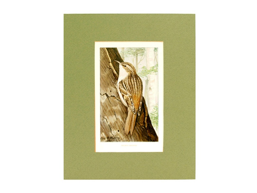 This color illustration of the Brown Creeper, although beautiful, doesn’t tell the whole story. The bird likes to play pranks. It has been seen whirling around like a top and flying up and down close to the tree trunk, apparently just for fun. When he wants to hide, he flattens himself against the bark of a tree. Because he looks so much like the tree trunk, you can hardly see him. The print is professionally matted in an 8” x 10” light green colored matte to setoff the beauty of the bird. Our vintage prints are shipped in a plastic sleeve between cardboard stiffeners to arrive in perfect condition.