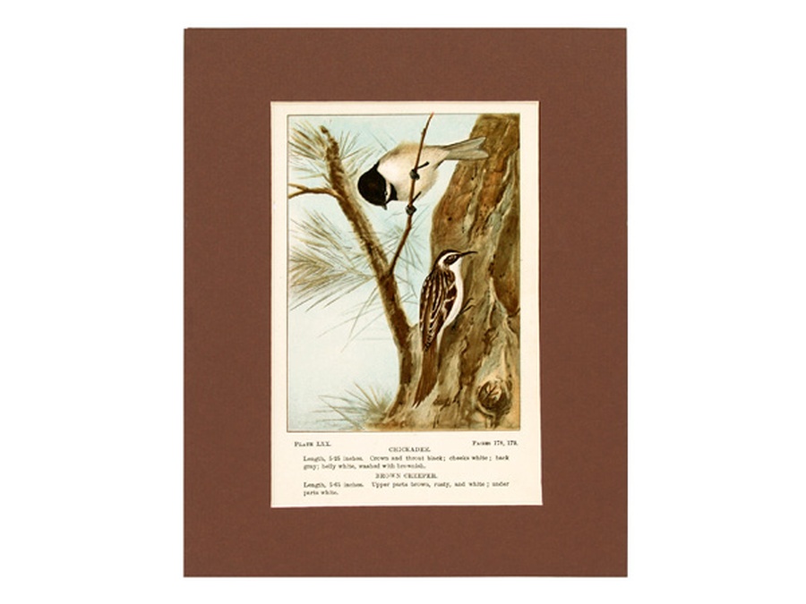 This vintage print is Plate LXX or 70 showing both a Chickadee and Brown Creeper in their natural habitat. The Black Capped Chickadee is a member of the Titmouse Family and a very tame and friendly bird. The Brown Creeper is like a Woodpecker climbing up and around trees looking for insect eggs. The print is professionally matted in an 8” x 10” brown colored matte to setoff the beauty of the birds. Our vintage prints are shipped in a plastic sleeve between cardboard stiffeners to arrive in perfect condition.