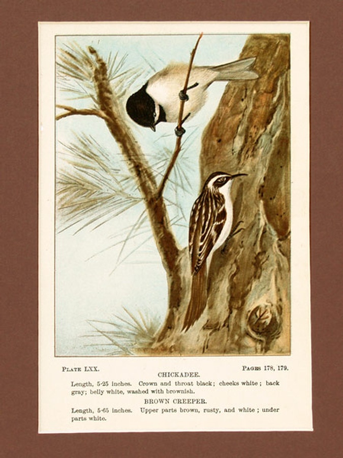 This antique color plate features a colorful image of a Chickadee and Brown Creeper. The print comes from the book Bird-Life, A Guide To The Study Of Our Common Birds by Frank M. Chapman, Curator of Ornithology, American Museum of Natural History. The book was originally copyrighted in 1897 and again in 1899 and 1901 by D. Appleton and Company. This edition published by McClelland & Goodchild Limited of Toronto is the Popular Edition in Colors from 1901. The colored plates were produced after drawings by Ernest Thompson Seton.