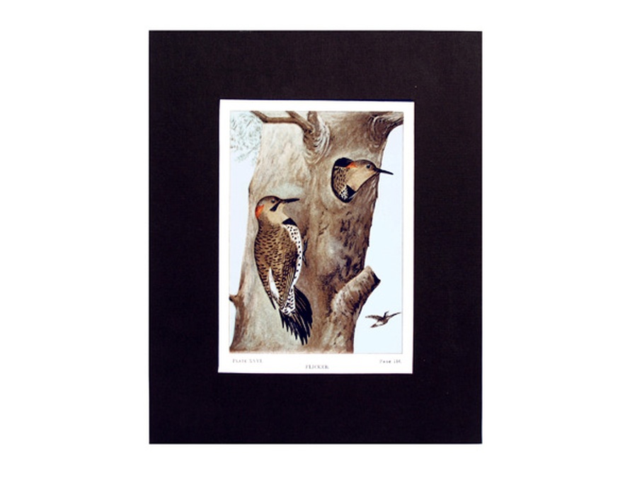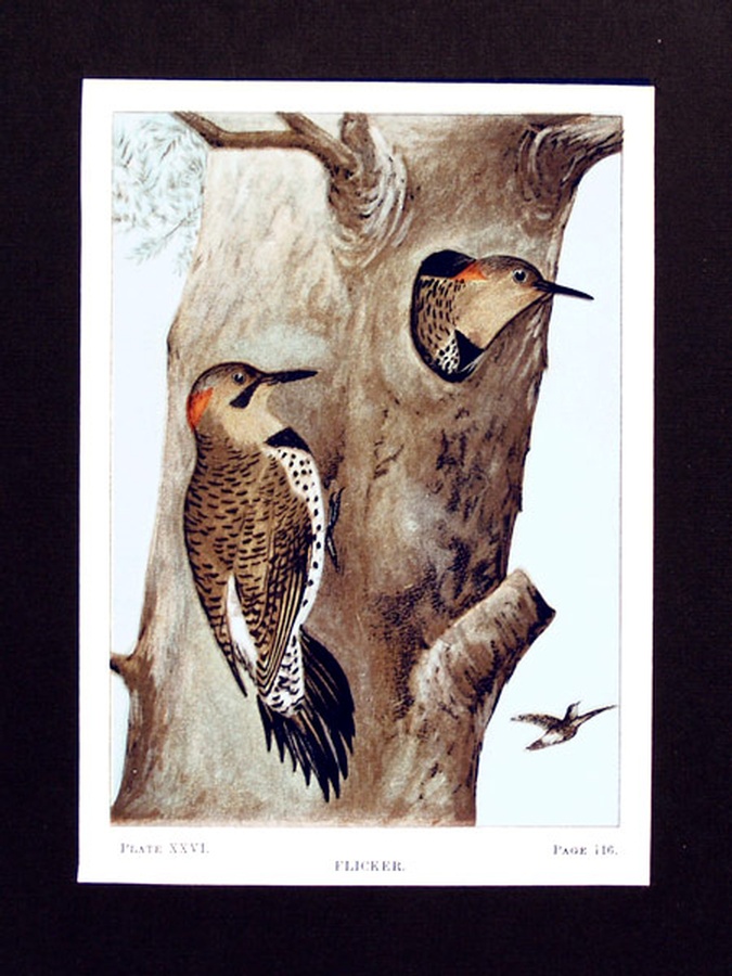This vintage print is Plate XXVI or 26 showing the Flicker in its natural habitat. This woodpecker is less of a carpenter than other species of woodpecker and prefers decayed logs and stumps for food. Here he finds his favorite food of ants. The print is professionally matted in an 8” x 10” black colored matte to setoff the beauty of the bird. Our vintage prints are shipped in a plastic sleeve between cardboard stiffeners to arrive in perfect condition.