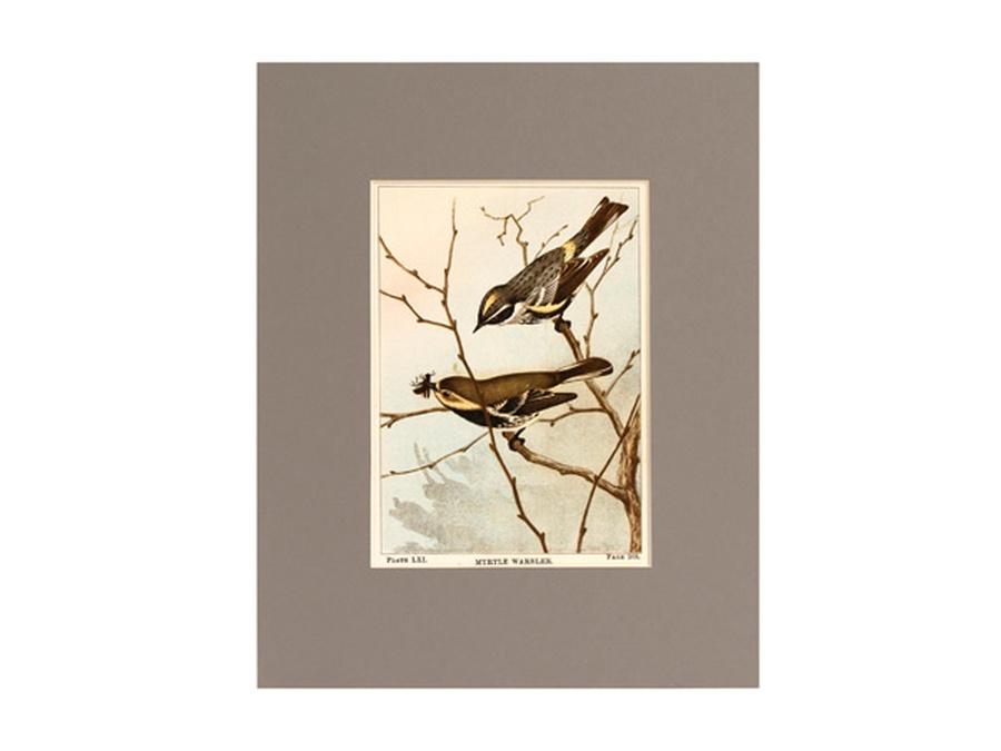 This vintage print is Plate LXI or 61 showing the Myrtle Warbler in its natural habitat. The Myrtle or Yellow-rumped Warbler is the only Warbler to remain in the Northern states during winter. It might have something to do with finding its favorite food of bayberries in the area up and around New York. The print is professionally matted in an 8” x 10” grey matte to setoff the beauty of the birds. Our vintage prints are shipped in a plastic sleeve between cardboard stiffeners to arrive in perfect condition.