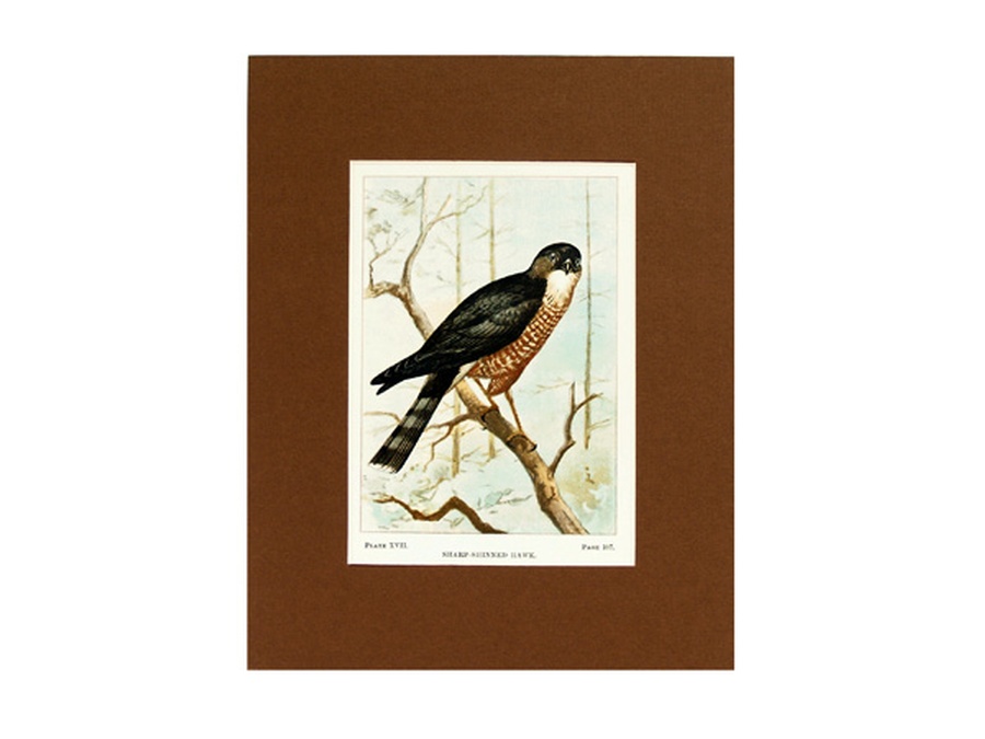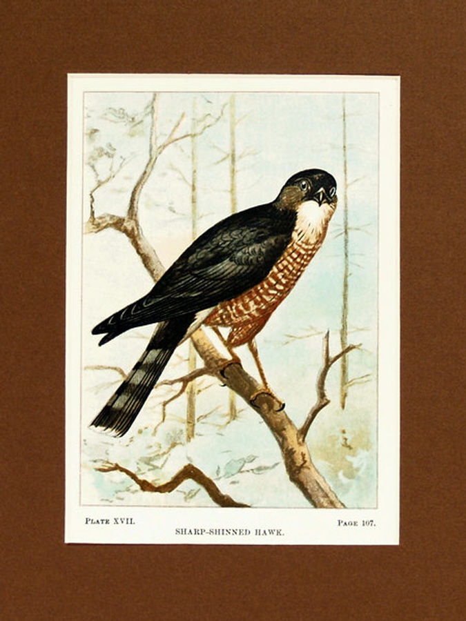 This vintage print is Plate XVII or 17 showing the Sharp-Shinned Hawk in his natural habitat. This is one of the real culprits in Hawkdom feeding almost exclusively on young birds. They can prove a big problem to farmers once getting a taste for young chickens, they make daily trips. The print is professionally matted in an 8” x 10” brown colored matte to setoff the beauty of the bird. Our vintage prints are shipped in a plastic sleeve between cardboard stiffeners to arrive in perfect condition.