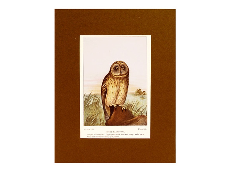This vintage print is Plate XIX or 19 showing the Short-Eared Owl in its natural habitat. Unlike most owls the Short-Eared Owl lives in large, grassy marshes. It spends the day on the ground and at dusk flies low over the marsh in search of meadow mice which is its main food supply. The print is professionally matted in an 8” x 10” dark brown colored matte to setoff the beauty of the bird. Our vintage prints are shipped in a plastic sleeve between cardboard stiffeners to arrive in perfect condition.