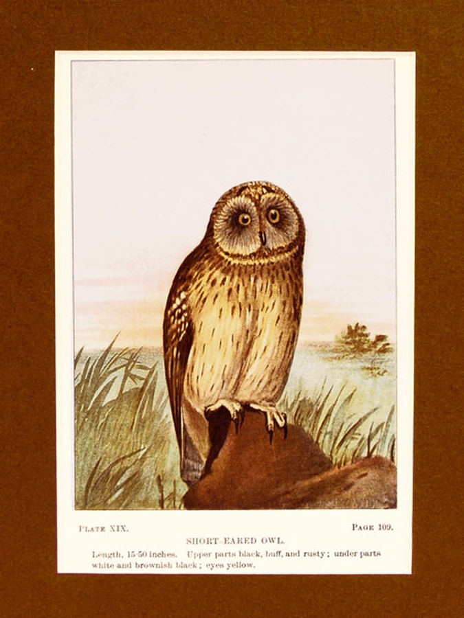 This antique color plate features a colorful image of a Short-Eared Owl. The print comes from the book Bird-Life, A Guide To The Study Of Our Common Birds by Frank M. Chapman, Curator of Ornithology, American Museum of Natural History. The book was originally copyrighted in 1897 and again in 1899 and 1901 by D. Appleton and Company. This edition published by McClelland & Goodchild Limited of Toronto is the Popular Edition in Colors from 1901. The colored plates were produced after drawings by Ernest Thompson Seton.