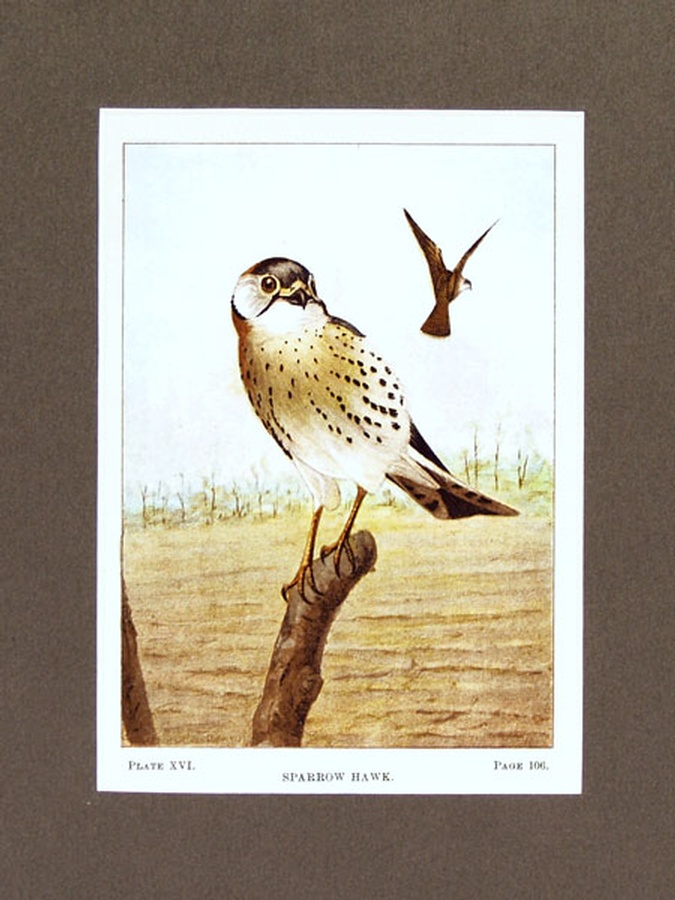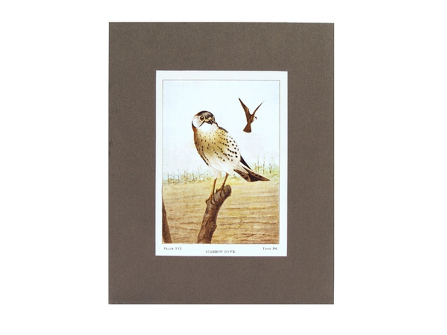 This vintage print is Plate XVI or 16 showing the Sparrow Hawk in his natural habitat. Grasshoppers are the Sparrow Hawk’s chief food. Unlike other Hawks, it chooses a hollow tree for a home, often using a Woodpecker’s deserted hole. The print is professionally matted in an 8” x 10” dark grey colored matte to setoff the beauty of the bird. Our vintage prints are shipped in a plastic sleeve between cardboard stiffeners to arrive in perfect condition.