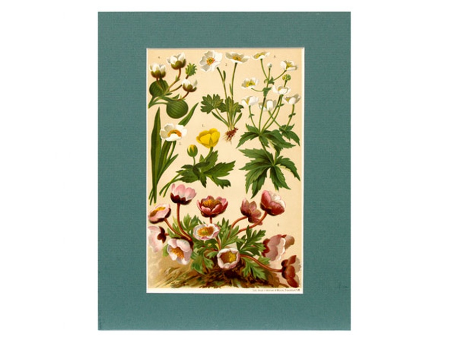 This is Tafel (Plate) 15 of the book which measures 4.75” x 7.5” and contains images of 6 Alpine Shrubs. They are Mountain Buttercup, Alpine Crowfoot, Aconite-leaved Crowfoot, Grass of Parnassus-leaved Crowfoot, Pyrenean Crowfoot, and Glacier Crowfoot. Attached to the back of the matte is the original book page describing the flowers.