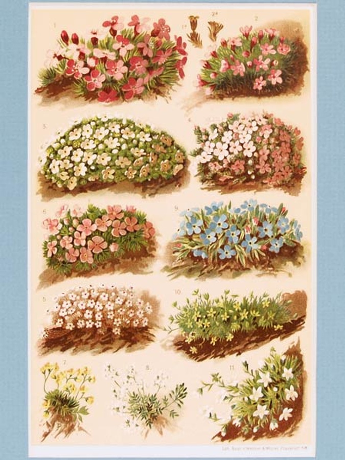 This is Tafel (Plate) 4 of the book which measures 4.75” x 7.5” and contains images of 11 Alpine Shrubs. They are Moss Campion, Cushion-Silene, Swiss Androsace, Glacier Androsace, Imbricated Androsace, Pyrenean Petrocallis, Zahlbruckner’s Draba, Short-stalked Hutchinsia, Alpine forget-me-not, Sedum like Cherieria, and Hairy Sand-wort. Attached to the back of the matte is the original book page describing the plants.