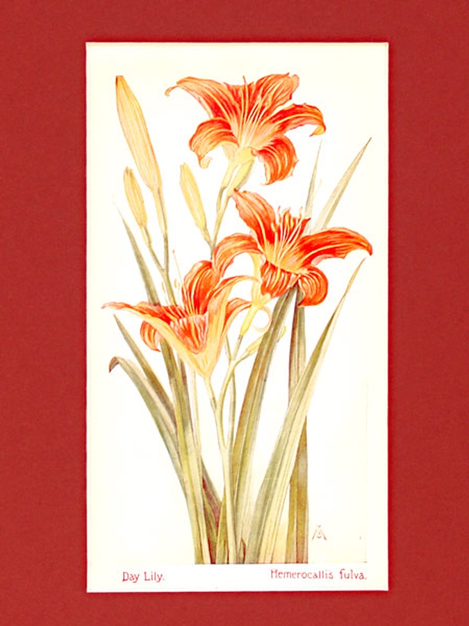 This delicately colored illustration features a cluster of Day Lilies in full bloom and ready to bloom. This lily was originally a native of Europe and Asia and escaped from gardens to our country. The technical name, Hemerocallis Fulva, comes from the Greek and means beautiful for only a day. The print is professionally matted in an 8” x 10” reddish/brick colored matte to highlight the beauty of the flowers. Our vintage prints are shipped in a plastic sleeve between cardboard stiffeners to arrive in perfect condition.
