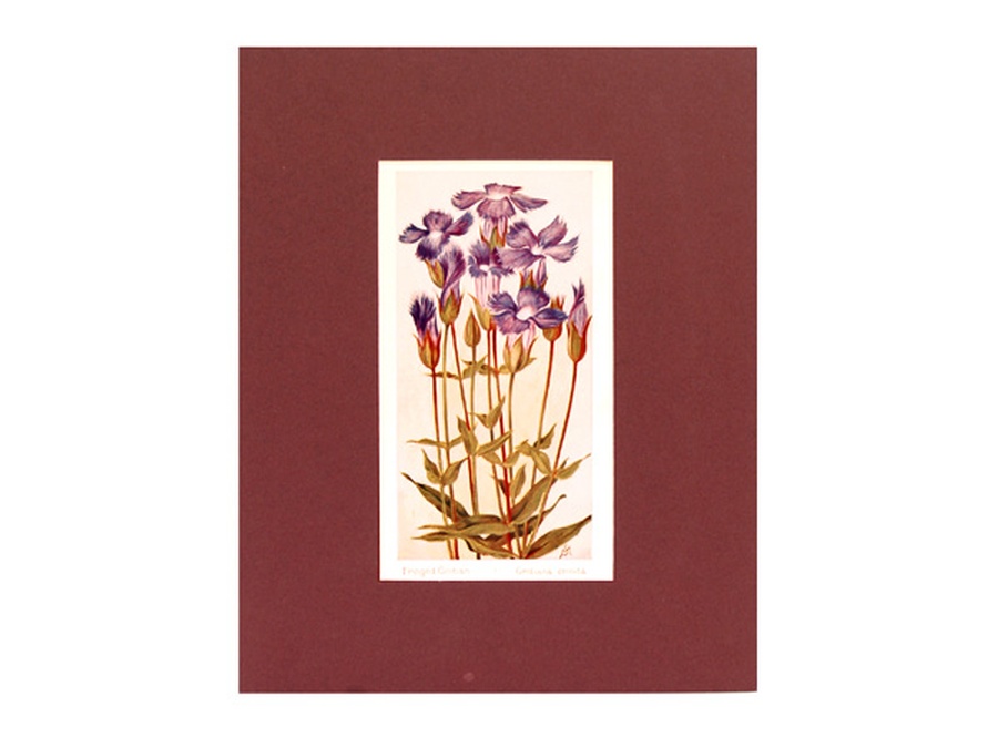 This vividly colored illustration features a cluster of beautiful Fringed Gentian in partial and full bloom. This is the most famous member of the Gentian Family because of its remarkable, delicate, misty violet-blue flowers with their expressive and unique form. The print is professionally matted in an 8” x 10” purple colored matte to highlight the beauty of the flowers. Our vintage prints are shipped in a plastic sleeve between cardboard stiffeners to arrive in perfect condition.
