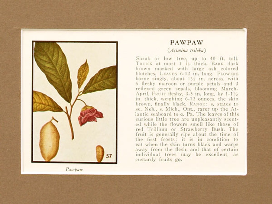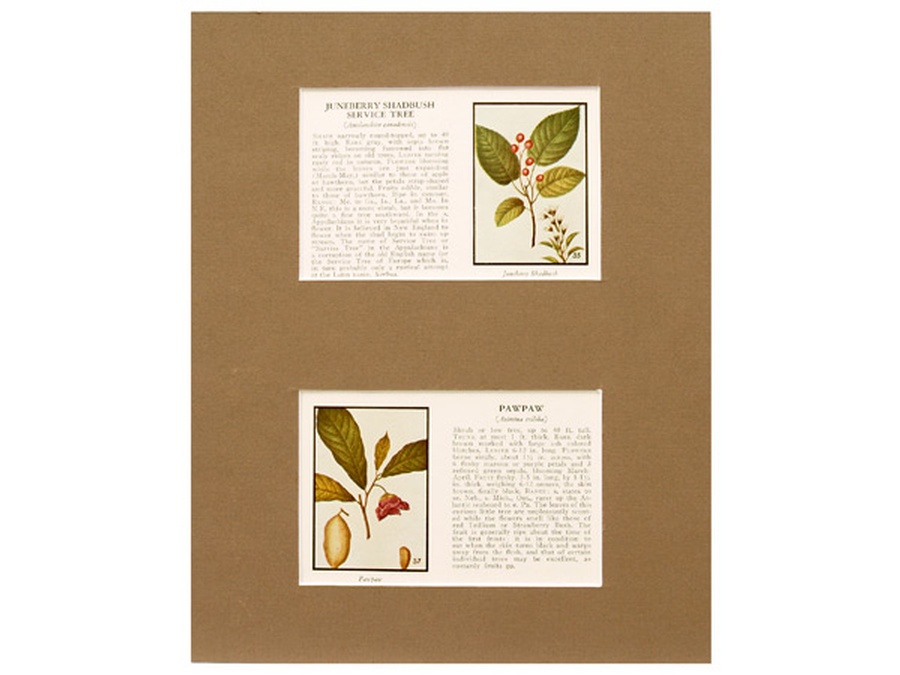 These illustrations and descriptions are of the Juneberry Shadbush Service Tree and Pawpaw Tree. They are professionally matted in an 8” x 10” pale brown colored matte to setoff the beauty of the images. Our vintage prints are shipped in a plastic sleeve between cardboard stiffeners to arrive in perfect condition.