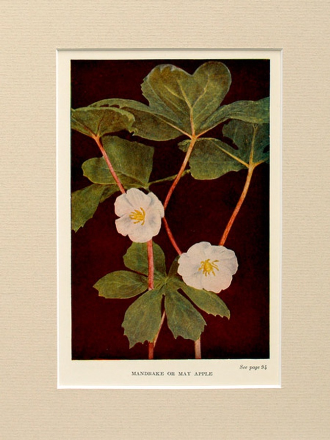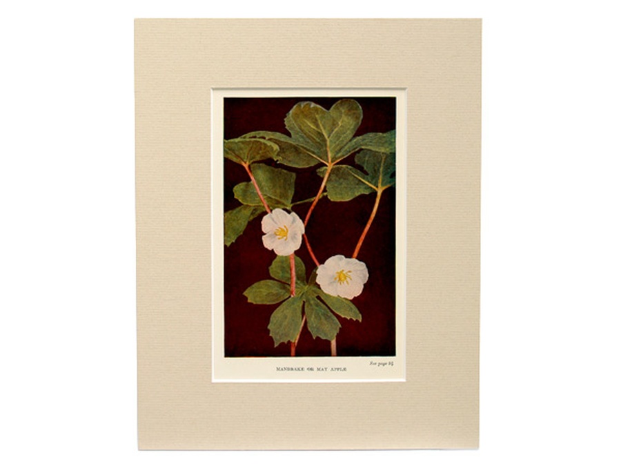 This antique color illustration has lovely white flowers against a striking dark background. The print comes from the book Wild Flowers Worth Knowing by Neltje Blanchan and adapted by Asa Don Dickinson for the Little Nature Library originally copyrighted in 1917 and published in 1923 by Doubleday, Page & Company for Nelson Doubleday, Inc.This plate is titled “Mandrake or May Apple” and its description was featured on page 74 of the book. Children used to call the leaves green umbrellas and declared they unfurl only during April showers. The flowers, although pretty, have an unpleasant scent and the fruit produced in July resembles a yellow egg-tomato. The print is professionally matted in an 8” x 10” grey/tan colored matte to setoff the beauty of the image and will be shipped in a plastic sleeve between cardboard stiffeners.