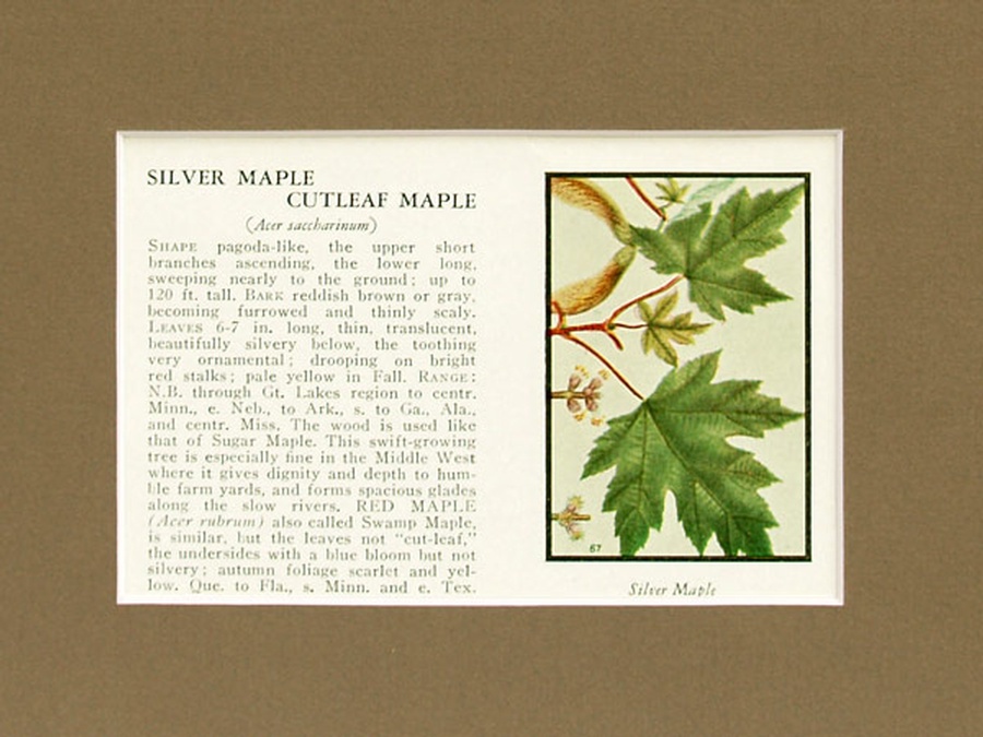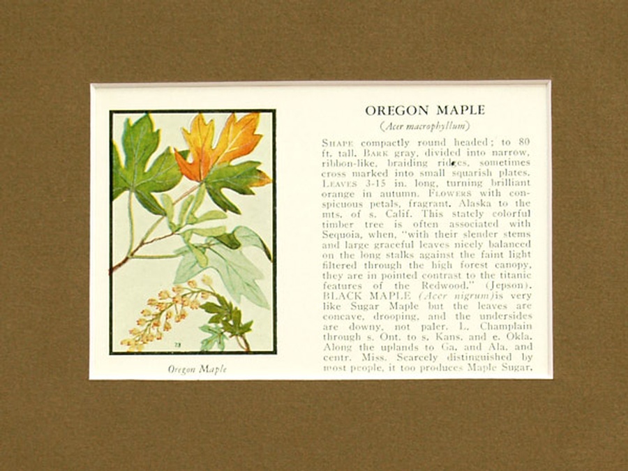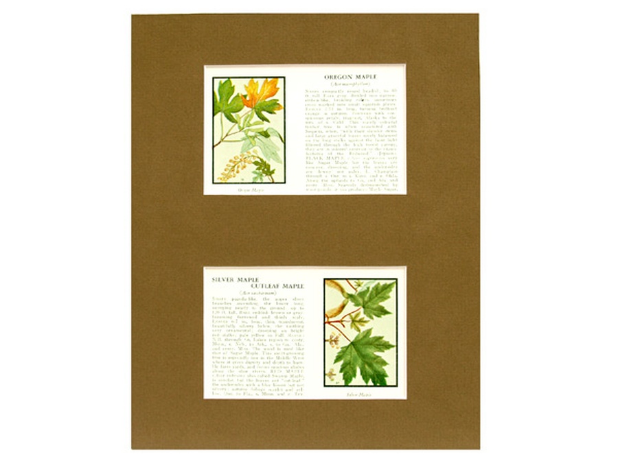 These illustrations and descriptions are of the Oregon Maple and Silver Maple, covering both sides of our country. They are professionally matted in an 8” x 10” light brown colored matte to setoff the beauty of the images. Our vintage prints are shipped in a plastic sleeve between cardboard stiffeners to arrive in perfect condition.