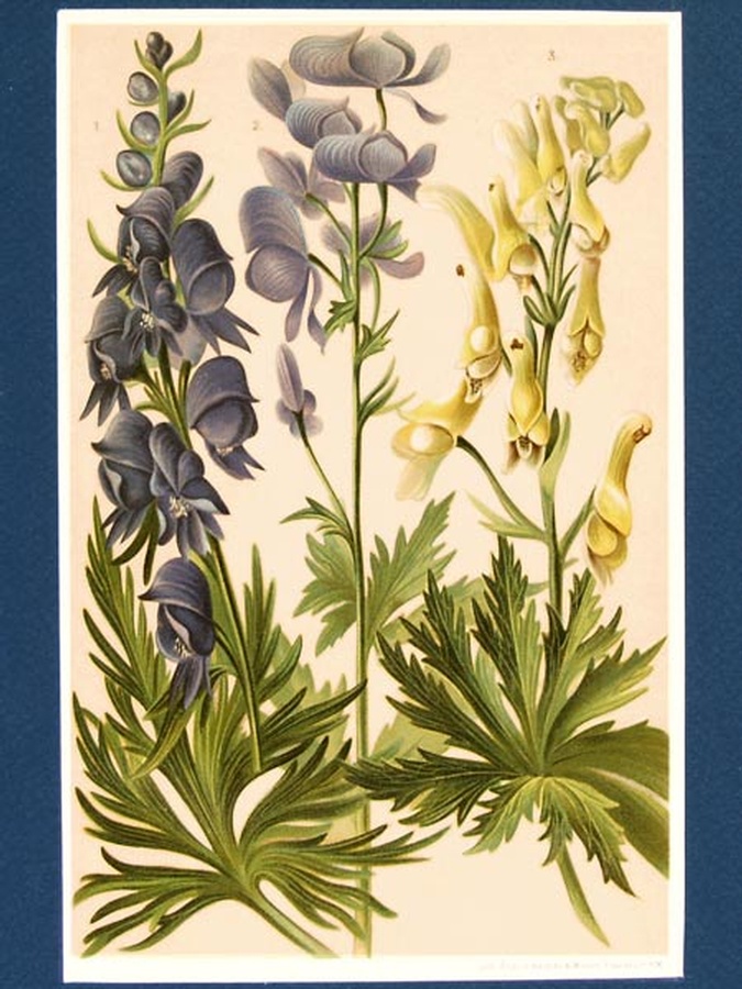 This is Tafel (Plate) 6 of the book which measures 4.75” x 7.5” and contains images of 3 Monk’s-hood flowers. They are Common Monk’s-hood, Panicled Monk’s-hood, and Yellow Wolf’s bane. The Monk’s-hoods are dependent on the bumble-bee for fertilization of the flowers. Where there are no bumble-bees there will be no Monk’s-hoods. Attached to the back of the matte is the original book page describing the flowers.