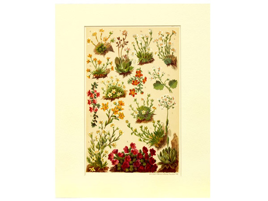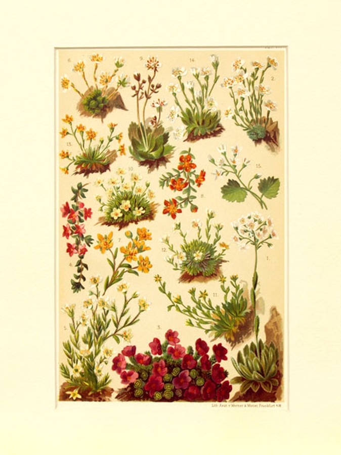 This is Tafel (Plate) 17 of the book which measures 4.75” x 7.5” and contains images of 15 Alpine Saxifrage plants. They are White Mountain Saxifrage, Grey Saxifrage, Purple Saxifrage, Two-flowered Saxifrage, Rough Saxifrage, Mosslike Saxifrage. Evergreen Saxifrage, Dark Yellow Evergreen Saxifrage, Star Saxifrage, Changeable Saxifrage, Narrow-petalled Saxifrage, Flat-leaved Saxifrage, Seguier’s Saxifrage, Androsace-like Saxifrage, and Round-leaved Saxifrage. Attached to the back of the matte is the original book page describing the flowers.