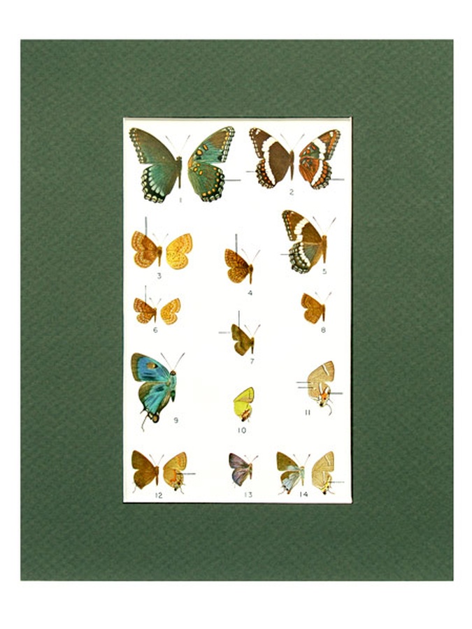 This illustration is Plate 15, featuring Fourteen (14) butterfly images by Marjorie Statham. We have included the original page describing each of the butterfly images on the back of this mounting. The print is professionally matted in an 8” x 10” dark green colored matte to setoff the beauty of the butterflies. Our vintage prints are shipped in a plastic sleeve between cardboard stiffeners to arrive in perfect condition.