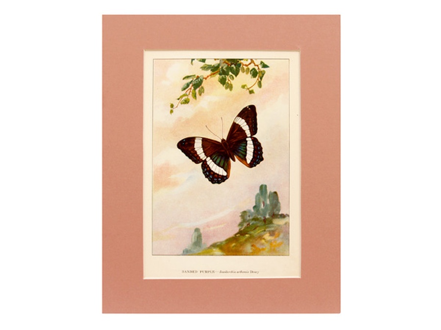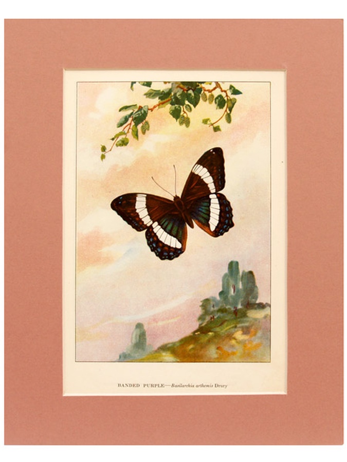 This colored illustration features the butterfly in its natural habitat. The Banded Purple Butterfly lays its eggs in July on the tips of low leaves of the black birch tree. The print is professionally matted in an 8” x 10” mauve colored matte to setoff the uniqueness of the butterfly. Our vintage prints are shipped in a plastic sleeve between cardboard stiffeners to arrive in perfect condition.