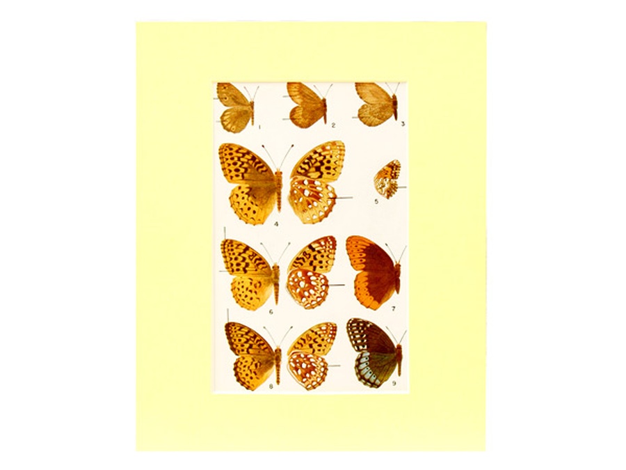 This illustration is Plate 8, featuring nine Satyrs and Fritillaries butterflies by Marjorie Statham. We have included the original page describing each of the butterfly images on the back of this mounting. The print is professionally matted in an 8” x 10” pale yellow colored matte to setoff the beauty of the butterflies.