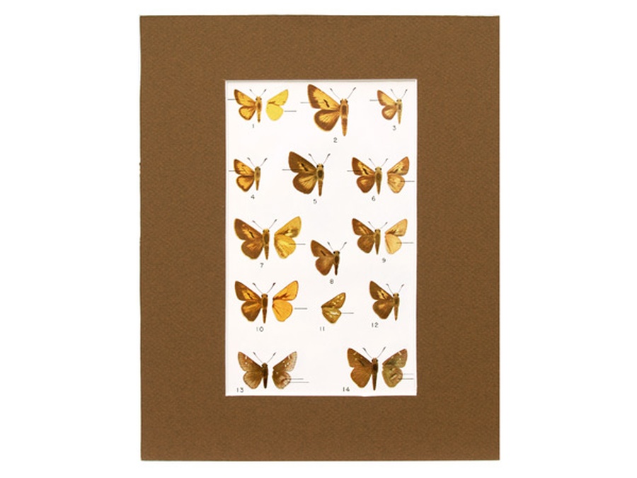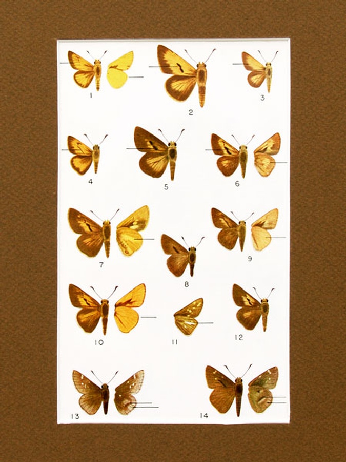 This illustration is Plate 36, featuring fourteen (14) Skipper butterflies by Marjorie Statham. We have included the original page describing each of the butterfly images on the back of this mounting. The print is professionally matted in an 8” x 10” brown colored matte to setoff the beauty of the butterflies.