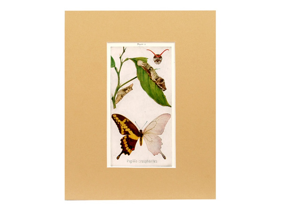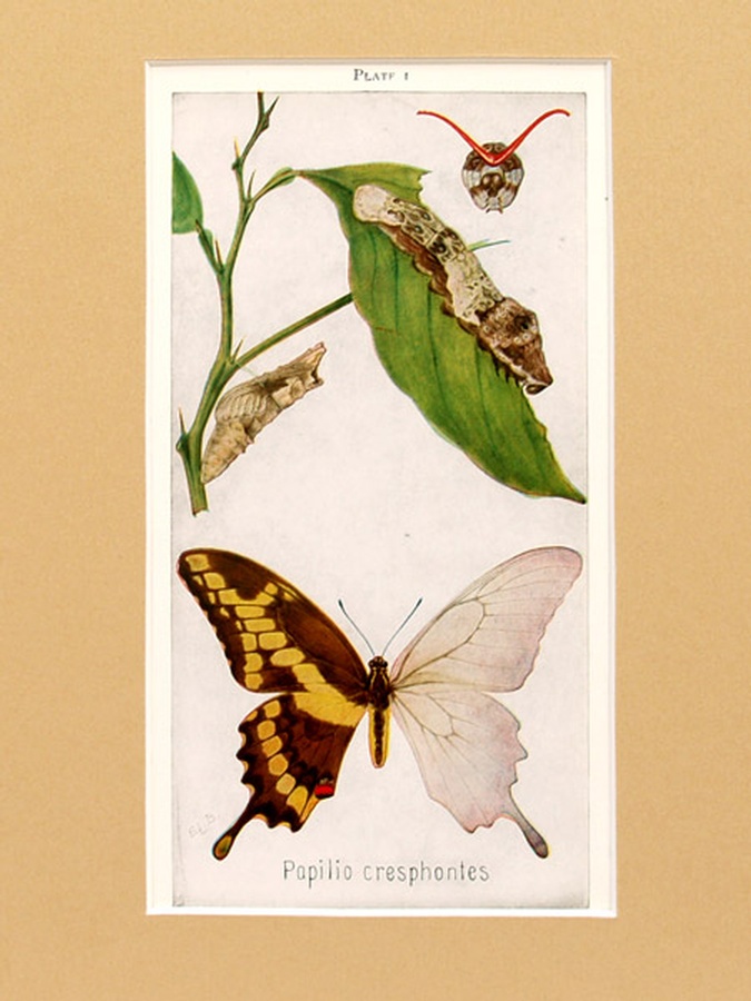 This colored illustration is Plate 1, featuring adult and caterpillar Giant Swallow-tail butterfly. The horns of the caterpillar shown in the illustration expel a fowl odor as protection making it the skunk of the insect world. The print is professionally matted in an 8” x 10” beige colored matte to setoff the uniqueness of the butterfly. Our vintage prints are shipped in a plastic sleeve between cardboard stiffeners to arrive in perfect condition.