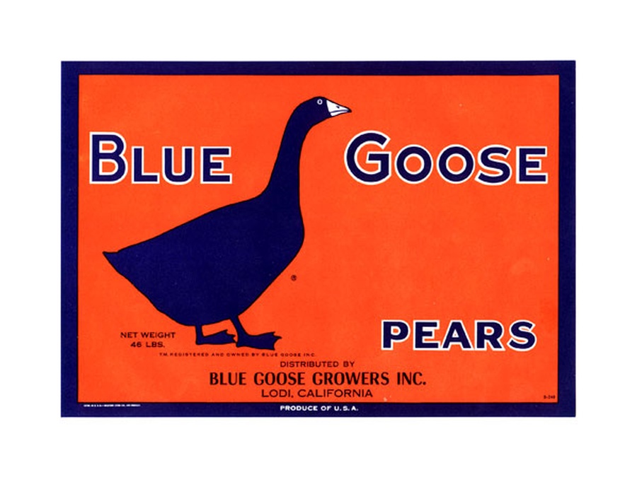 This vintage Blue Goose pear label measures 10.5” Wide x 7.25” Tall and dates back to the 1940s. The label features the famous large vivid blue goose on an orange background. This beautiful lithography was designed and executed by the Western Litho Co. of Los Angeles, California. The pears were grown and distributed by Blue Goose Growers, Inc. of Lodi, California. This is just a beautiful label to frame and hang in your kitchen.