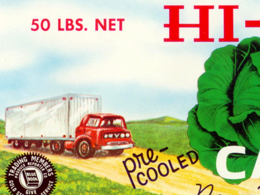 This vintage crate label comes from Dover, Delaware, and measures “ Wide x “ High and is from the 1960s. The label features a large pair of cabbages in the center with the farm in the background and a dirt road with an old style semi-trailer headed to the farm. This vintage label went on a 50 pound box of cabbages. The produce was grown and packed by Papen Farms, Inc.