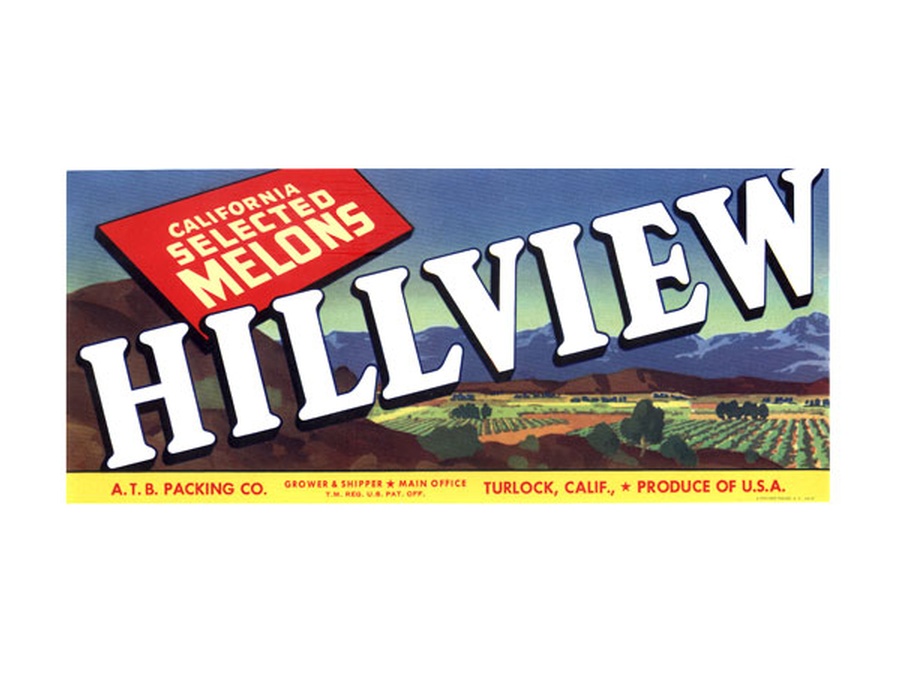 This California melon label measures 9.75” Wide x 4.25” High and is probably from the late 1950s. It features a view looking down from a hill or small mountain on the melon groves. The produce was packed and shipped by the A.T.B. Packing Company of Turlock, California. Turlock became known as the "Heart of the Valley" (Central Valley) because of its rich and abundant agricultural production. In the 1930s Turlock was cited by Ripley's Believe It or Not as having the most churches per capita in the country. This largely developed from the diverse ethnic population that came to the area.