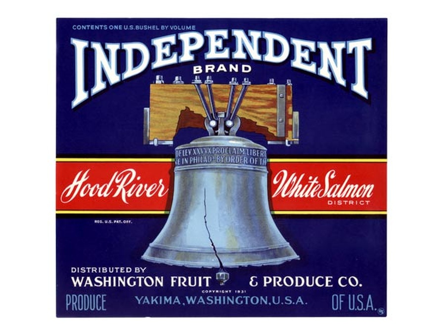 The Independent Brand crate label features a great image of the Liberty Bell prominently in the center of the label on a blue background. It is marked with the growing region, Hood River, and the specific area, White Salmon District. This label measures 10” Wide x 9” High and is from the 1940s. The produce was packed and distributed by the Washington Fruit & Produce Company of Yakima, Washington.