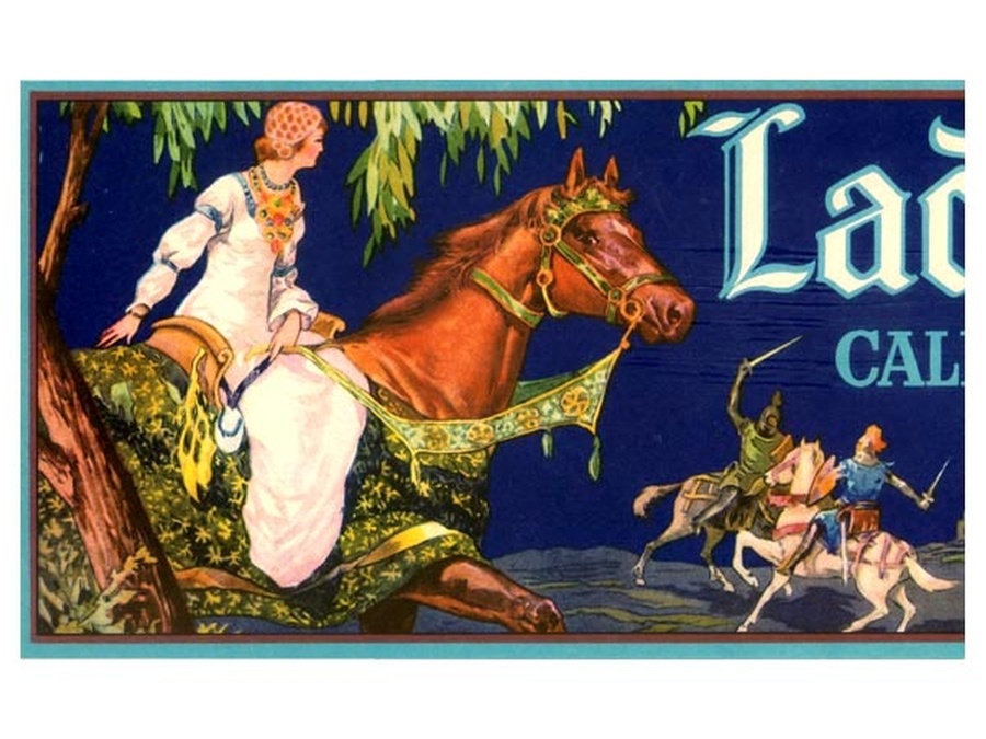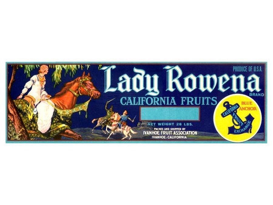 This wonderful original crate label from the 1940s measures 12.75" Wide x 4" Tall. It features a great image of "Lady Rowena" on horseback watching two Knights fight, possibly over her. The crate label was for grapes packed and shipped by Ivanhoe Fruit Association from Invanhoe, California. They were part of the California Fruit Exchange which is represented by the blue anchor. This mint label would be great to add to your collection or displayed in your kitchen.