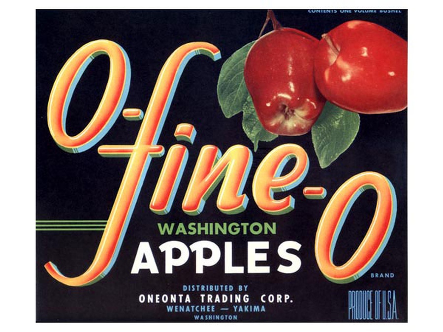 In 1934, excited by the burgeoning worldwide demand for fresh produce, Paul Thomas and his family formed Oneonta Trading Corporation in Wenatchee, Washington and became the first exporter of Washington apples. This packing company derives its name from the indigenous language of the Northeast American Indians. The Iroquois word, "Onaanta," has but two (of many) translations, which perfectly describe the panorama of central Washington. It means "mountain," or "where the rocks crop out." Reflecting the innovative and pioneering spirit of those who had blazed America's trail westward in the nineteenth century. The O-Fine-O Brand was from the 1950s and this label was used on bushel crates.