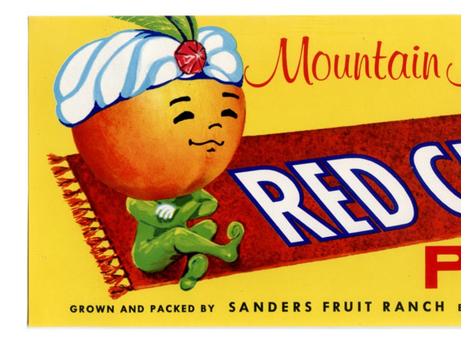 What a great whimsical label from Idaho in mint unused condition. This 10.25” Wide x 4” High crate label features a genie with a peach head, sporting a turbine on a red carpet. The fruit was grown and packed by Sanders Fruit Ranch in Emmett, Idaho, and dates from the 1960s.John Sanders who was born in 1853 and farmed in Iowa, made the move to Idaho in 1909 and settled on a forty-acre farm with his wife, Grace. They had 10 children and John worked the property vigorously until his death in 1914. Some of his children continued to work the ranch, located just 2 miles outside of Emmett, after his death. I think it just makes the label that much more special.