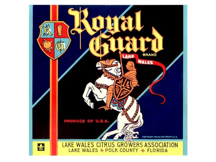 This Florida citrus label is from 1932 and measures 9” High x 9” Wide. The fruit was packed by the Lake Wells Citrus Growers Association from Lake Wells, Polk County, Florida. The label is in unused mint condition and features a knight on horseback with a Royal Guard crest.Florida citrus labels were always colorful and often humorous. Growers in certain areas of Florida frequently used the labels to promote a particular theme or to identify their products with a particular concept. The Lake Wales Citrus Growers Association almost always used royalty as a theme with such labels as "Royal Guard," "Prince of Wales," and "Crown Jewel."