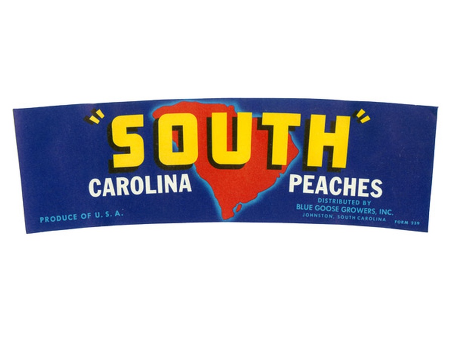Our “South” Carolina peach basket label measures 2.6” x 8.75” and is from the 1950s. The label features the outline of South Carolina in the background and the fruit was grown and distributed by Blue Goose Growers, Inc. of Johnston, South Carolina.