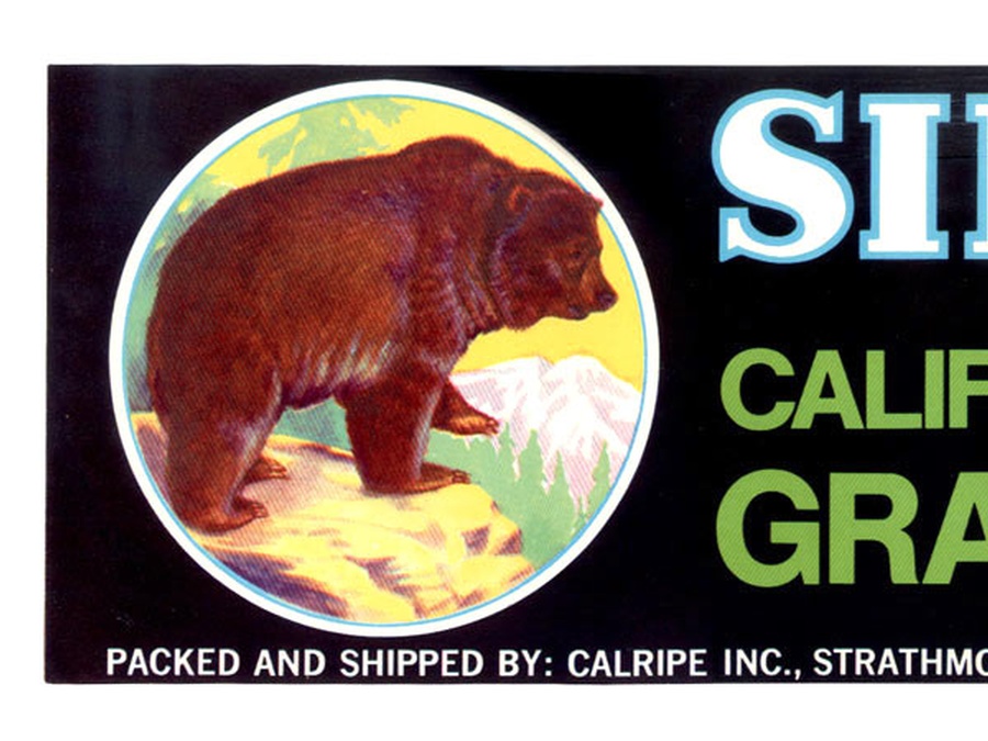 This grape crate label from California measures 13” Wide x 4” High and is in mint unused condition. The label displays in a circle on the left a large Brown bear on a cliff overlooking the forest and mountains. On the right are clusters of red, white, and black grapes with a black background to set off both images.