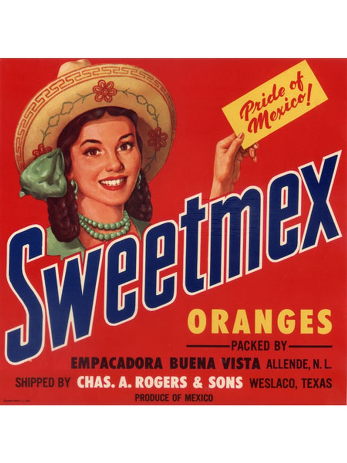 This beautiful vintage lithograph is of the Sweetmex Brand of Oranges from Empacadora Buena Vista Company of Mexico. The crate label is from the 1940s and shows a pretty woman in a Sombrero holding a small sign saying Pride of Mexico. Measuring 9” Wide x 9” High, the label identifies the shipper as Chas. A. Rogers & Sons of Weslaco, Texas. The label was lithographed by Stecher-Traung Litho Co, of San Francisco, California.