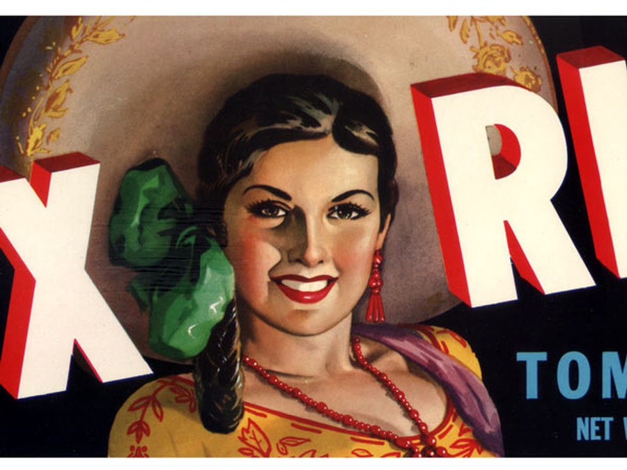 This tomato crate label from Texas measures 13” Wide x 5” High and is in mint condition from the 1960s. This very popular crate label features a beautiful Mexican senorita wearing a large sombrero. She has, what appears to be, green bell peppers on the side of her head, even though this is a tomato crate label.