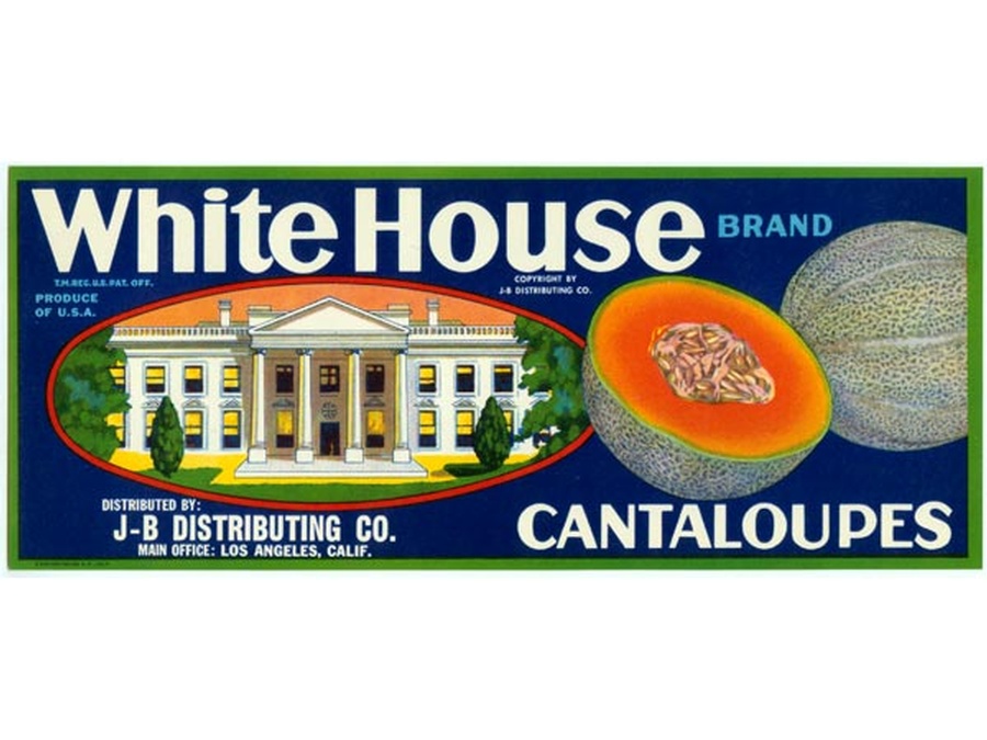 This vintage California crate label measures 9.6” Wide x 4” High and is from the 1940s – 1950s. The label features a great drawing of the White House in an oval next to a cut open cantaloupe on a dark blue background. The melons were grown and distributed by the J – B Distributing Company whose main office was in Los Angles, California. The company was an early member of the Western Growers Protective Association.