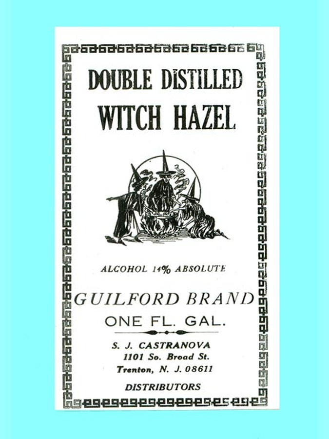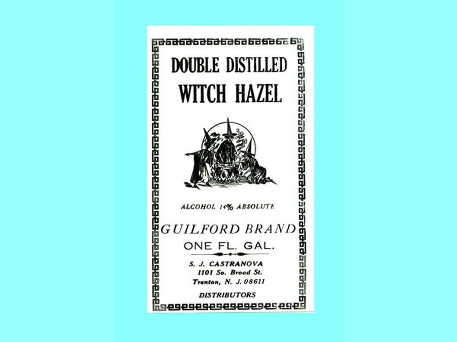 This Witch Hazel label measures 4.75” Tall x 2.75” Wide and features an image of three witches huddled over and stirring a cauldron. The Guilford Brand was probably produced by the E. E. Dickinson Company which controlled production in Connecticut, which represented almost all of the commercial production in the U.S. The retailer stamped on the label is S. J. Castranova of Trenton, New Jersey.