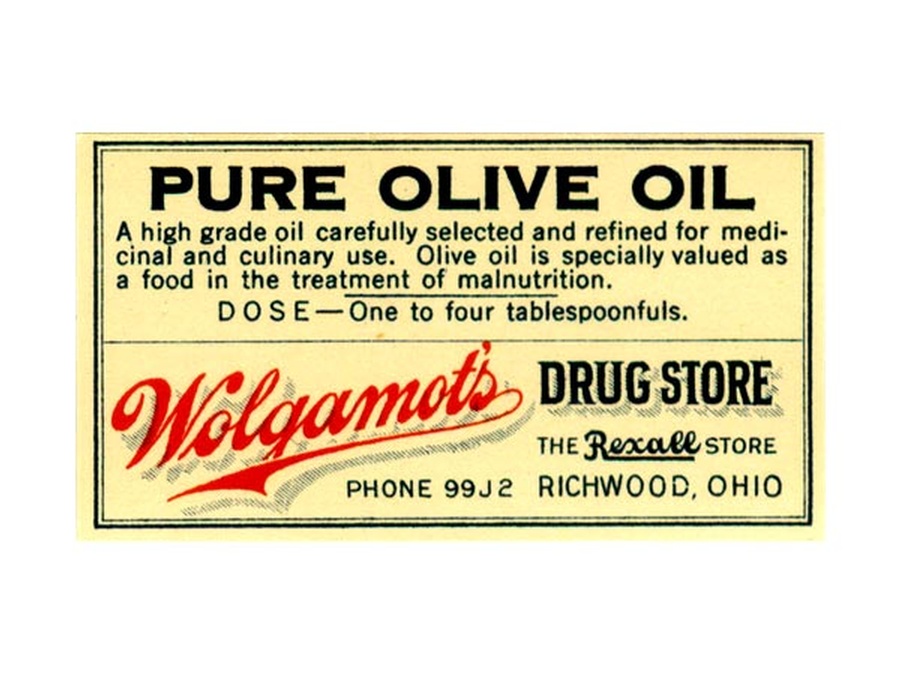 This vintage label comes from the Wolgamot's Drug Store in Richwood, Ohio, a Rexall store. I'm not saying its old, but check out the telephone number, 99J2. The label says it "was selected and refined for medicinal and culinary use." Two somewhat different purposes. It also was used in the treatment of malnutrition, now arn't you happy you had vinegarette dressing on your salad. This label measures 2.5" Wide x 1.5" High and is in mint condition.