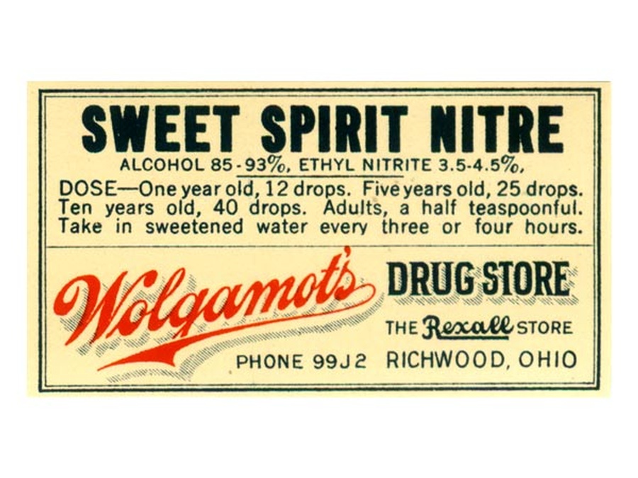 It is obtained by distilling alcohol with nitric and sulphuric acids. Sweet Spirit Nitre is a pale yellow liquid with a sweetish taste and a pleasant ethereal odor. This label measures 2.5" Wide x 1.5" High and is in mint condition.